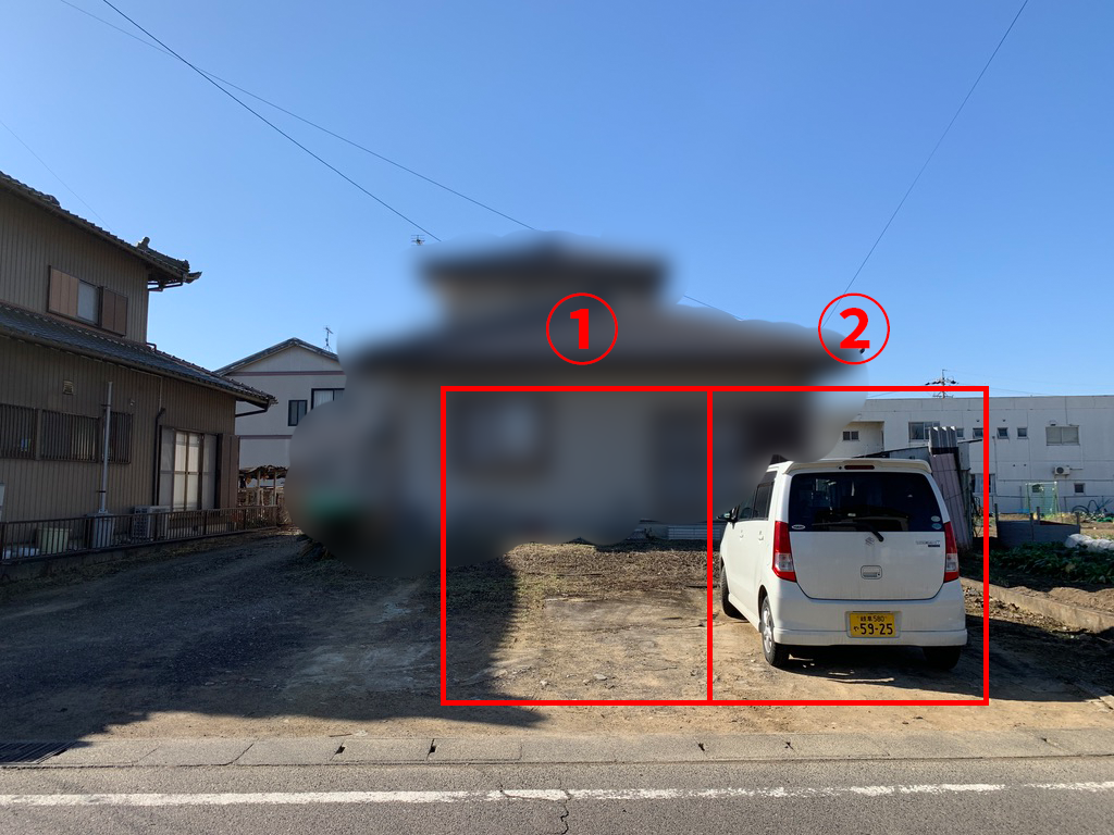 車でお越しの方は上記写真の①の位置(白いワゴンRの隣の位置)に車をお停め下さい。